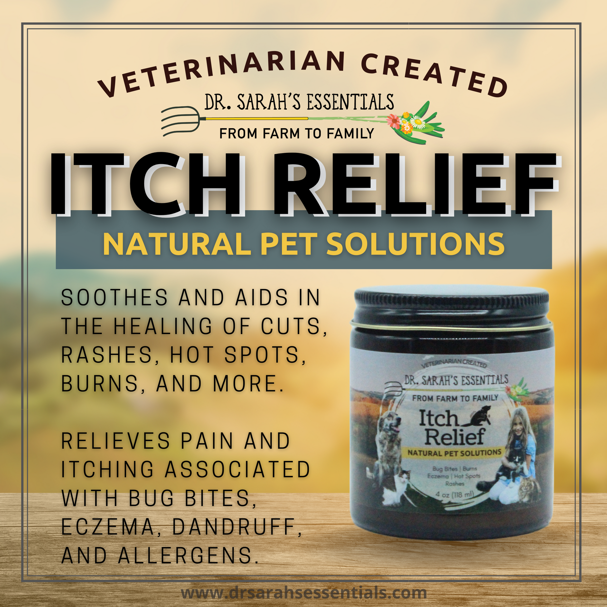Itch Relief | 4 oz | Soothes and aids in healing of cuts, rashes, hot spots, burns and more. Helps relieve pain and itching associated with bug bites, eczema, dandruff, and allergens.