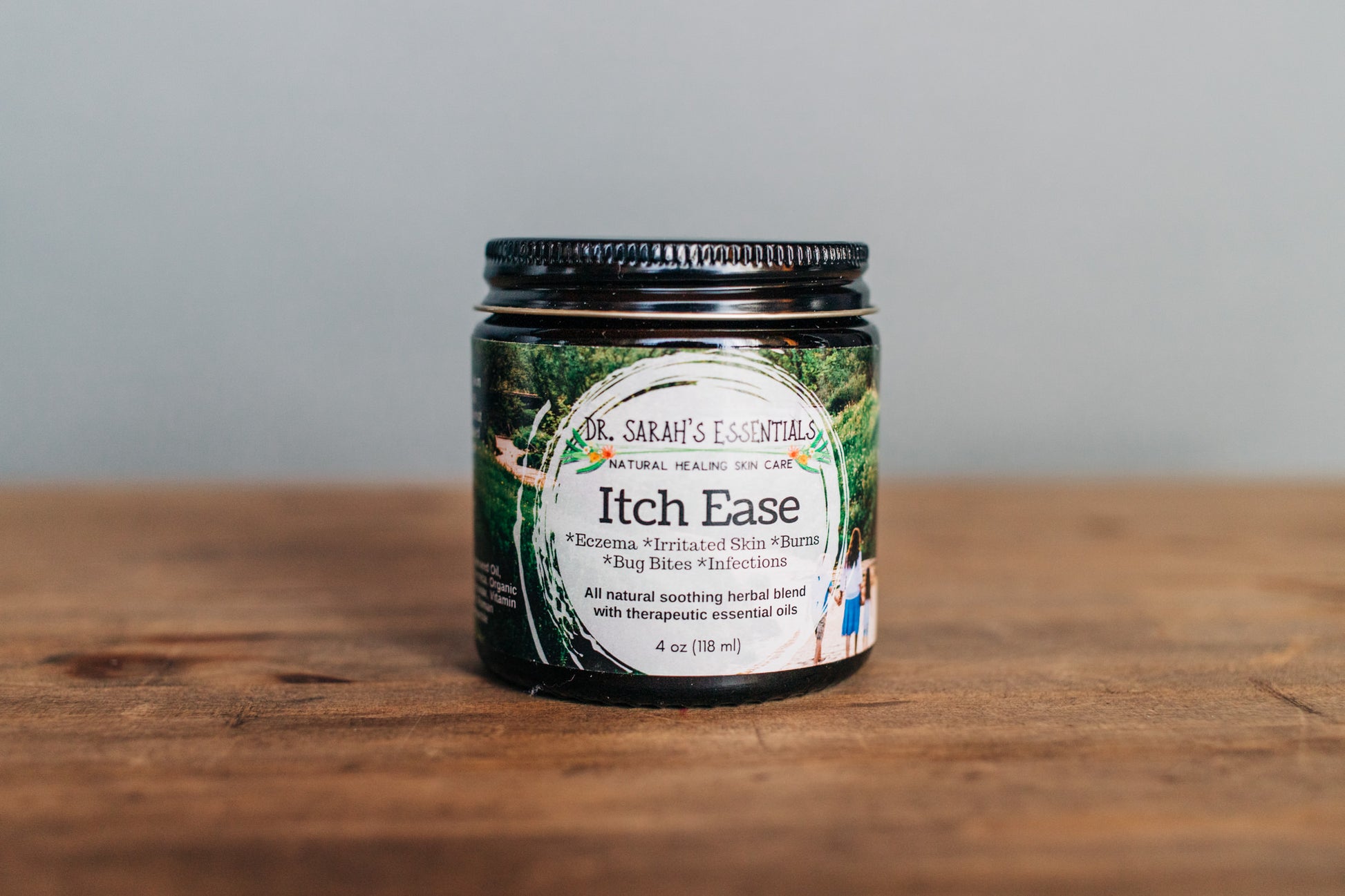 Itch Ease (4 oz) is great for eczema, irritated skin, burns, bug bites, and infections. This is an all-natural soothing herbal blend with therapeutic essential oils.